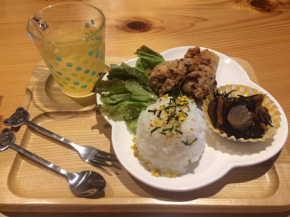 内容:からあげ3つ / 副菜1品 / りんごジュース