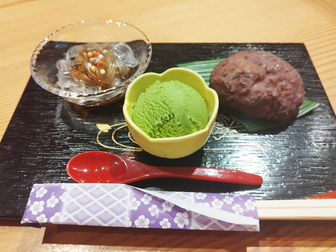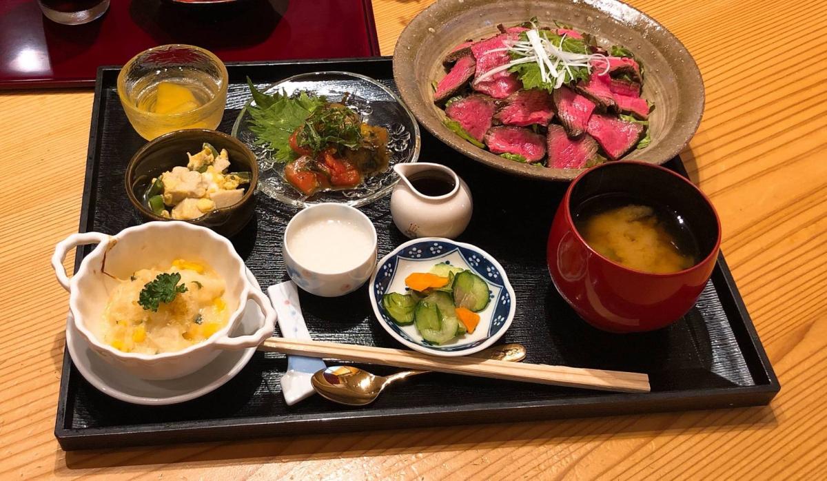 内容:ローストビーフどん / 小鉢3品 / コーヒー / ミニデザート / おはぎ